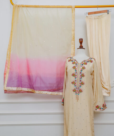 Beige Multicolor Embroidered Luxury Pret Dress with Ombre Dupatta | Designer 3 Piece Suit for Women