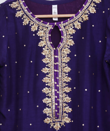 Royal Purple Luxury Pret Dress with Gold Embroidery & Wide-Leg Pants | Designer Pakistani Formal Suit