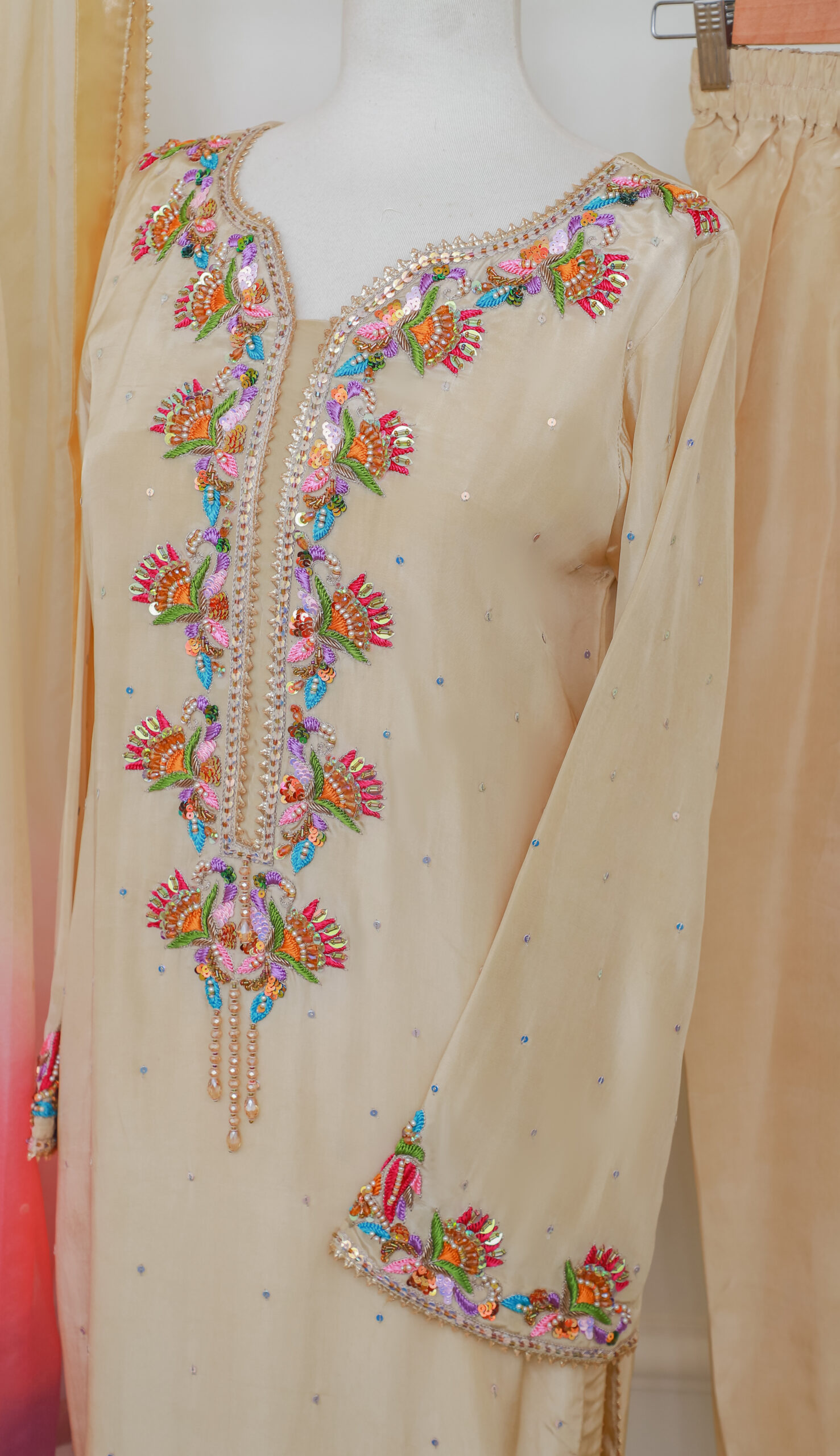 Make a graceful statement with this beautifully crafted beige luxury pret ensemble, enhanced with vibrant multicolor embroidery. Designed for women who love a blend of tradition and modern charm, this outfit features intricate threadwork on the neckline, sleeves, and hem.
