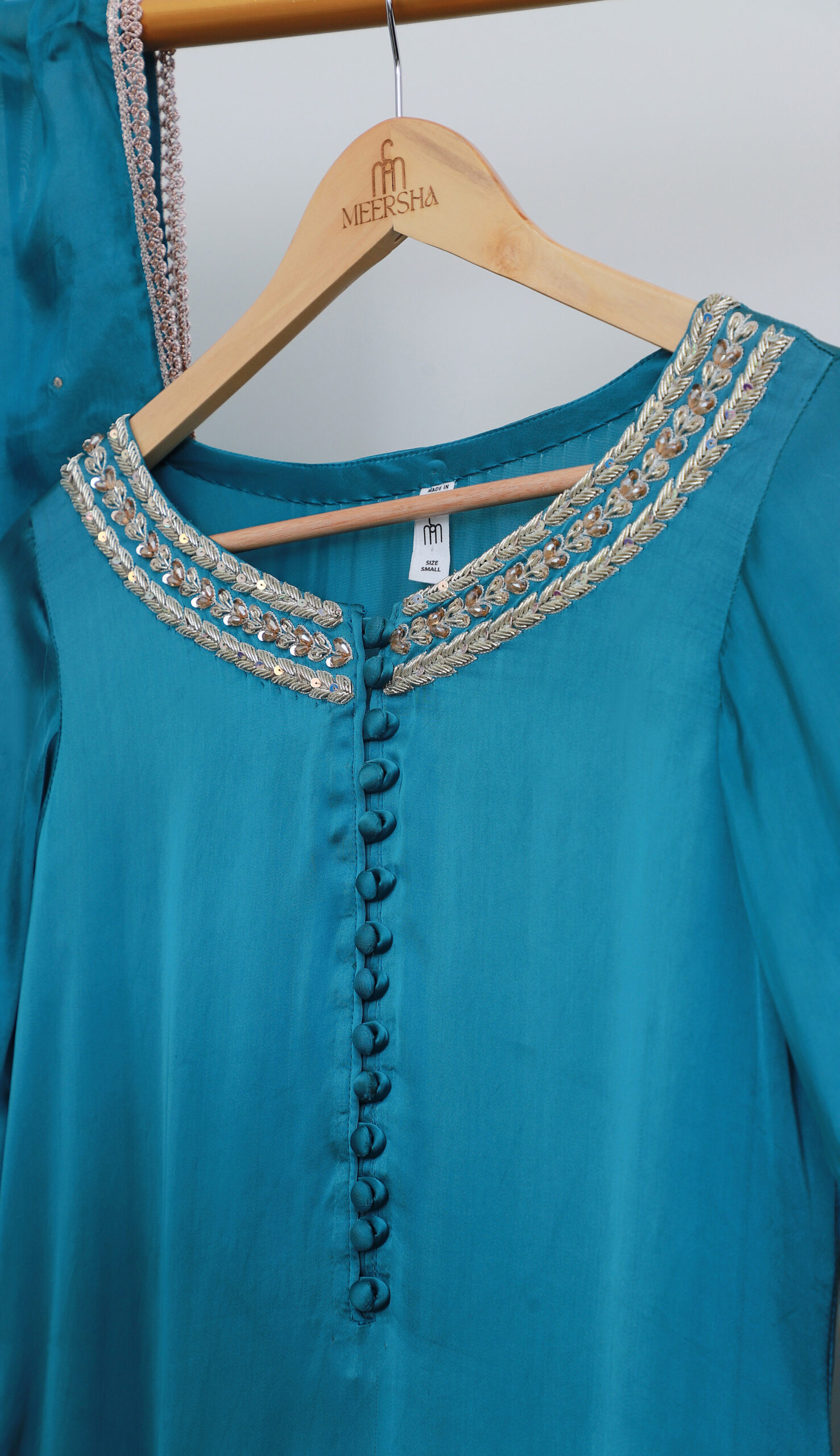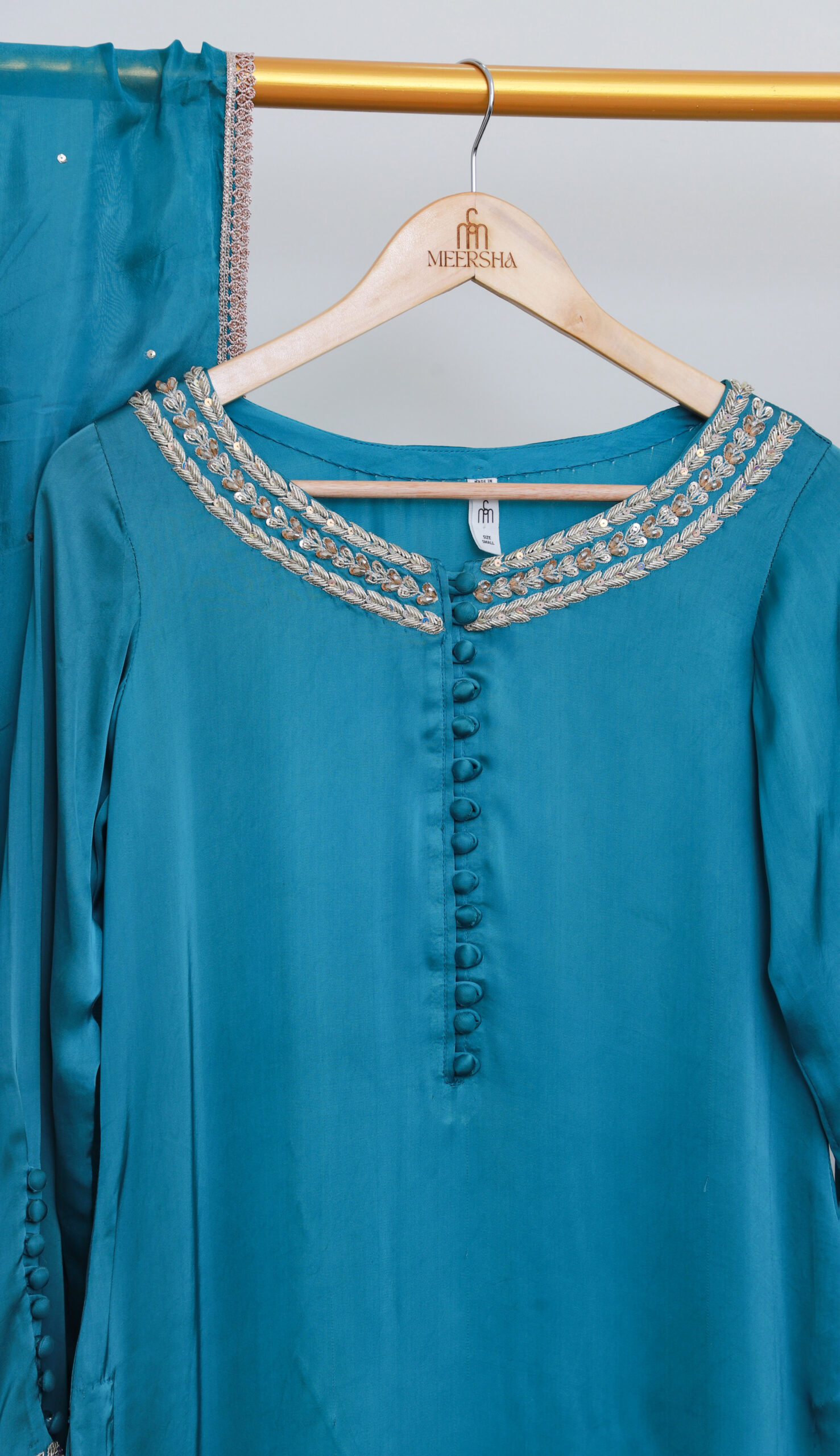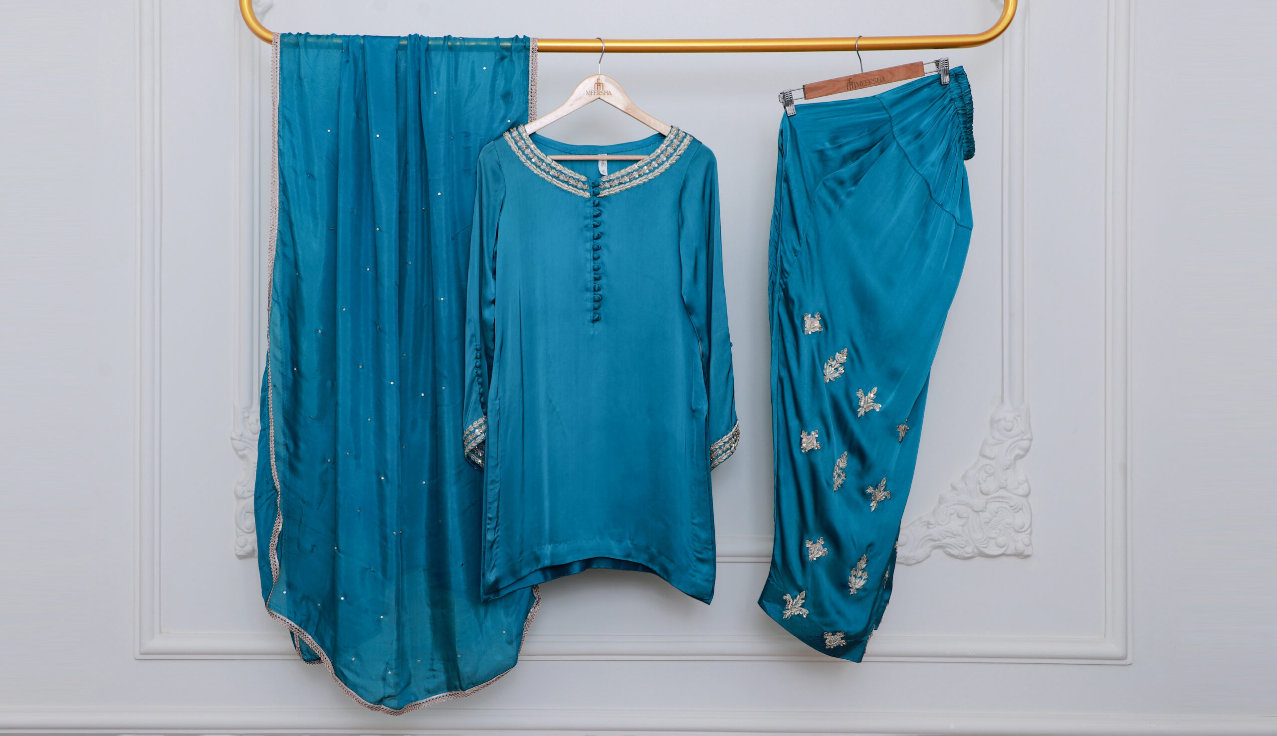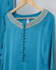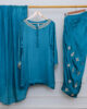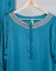 Embrace effortless sophistication with this stunning teal blue luxury pret ensemble, designed for a refined and modern look. The shirt features a clean silhouette with subtle embellishment along the neckline and sleeves, offering a minimalist yet luxurious appeal.