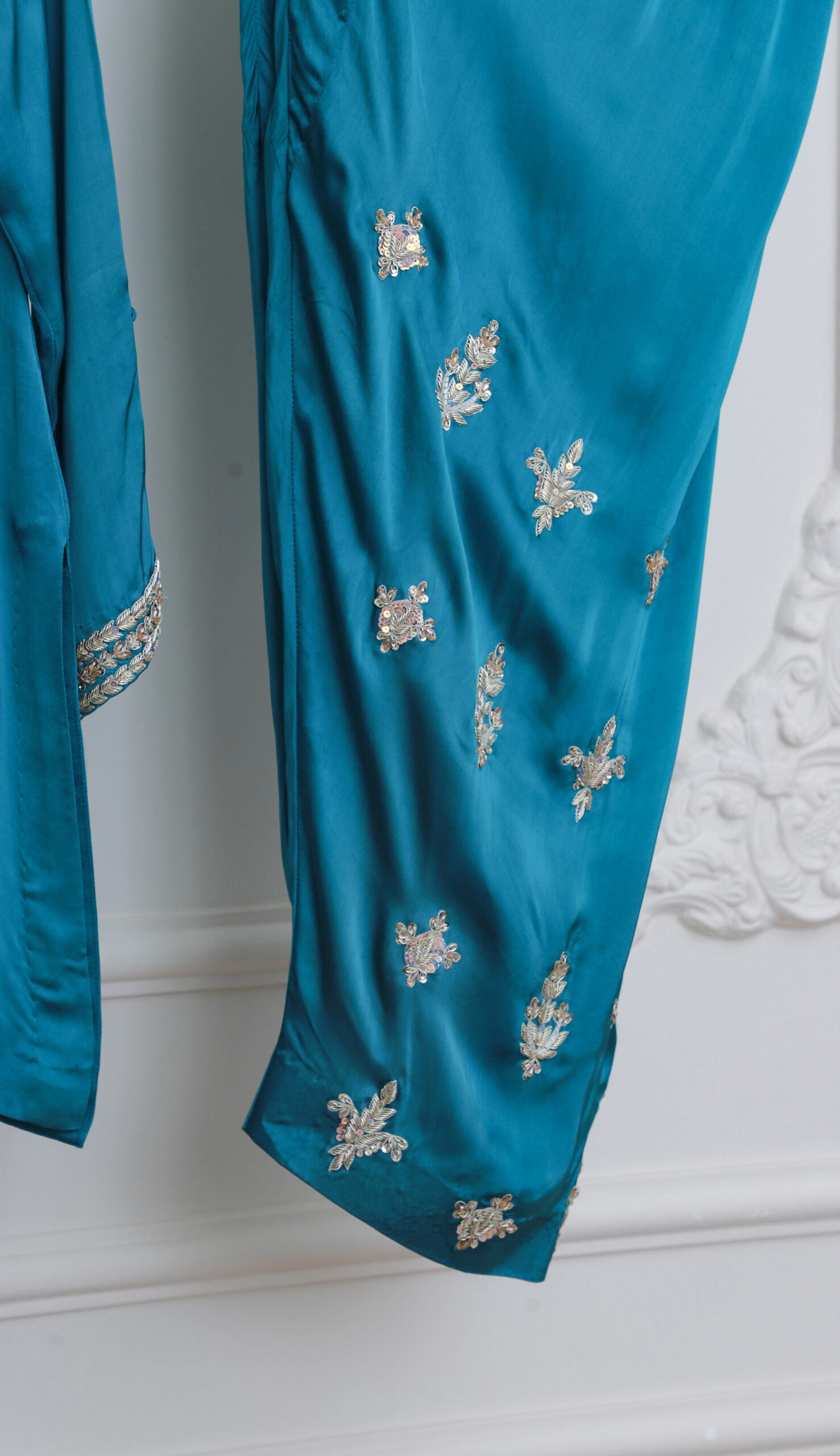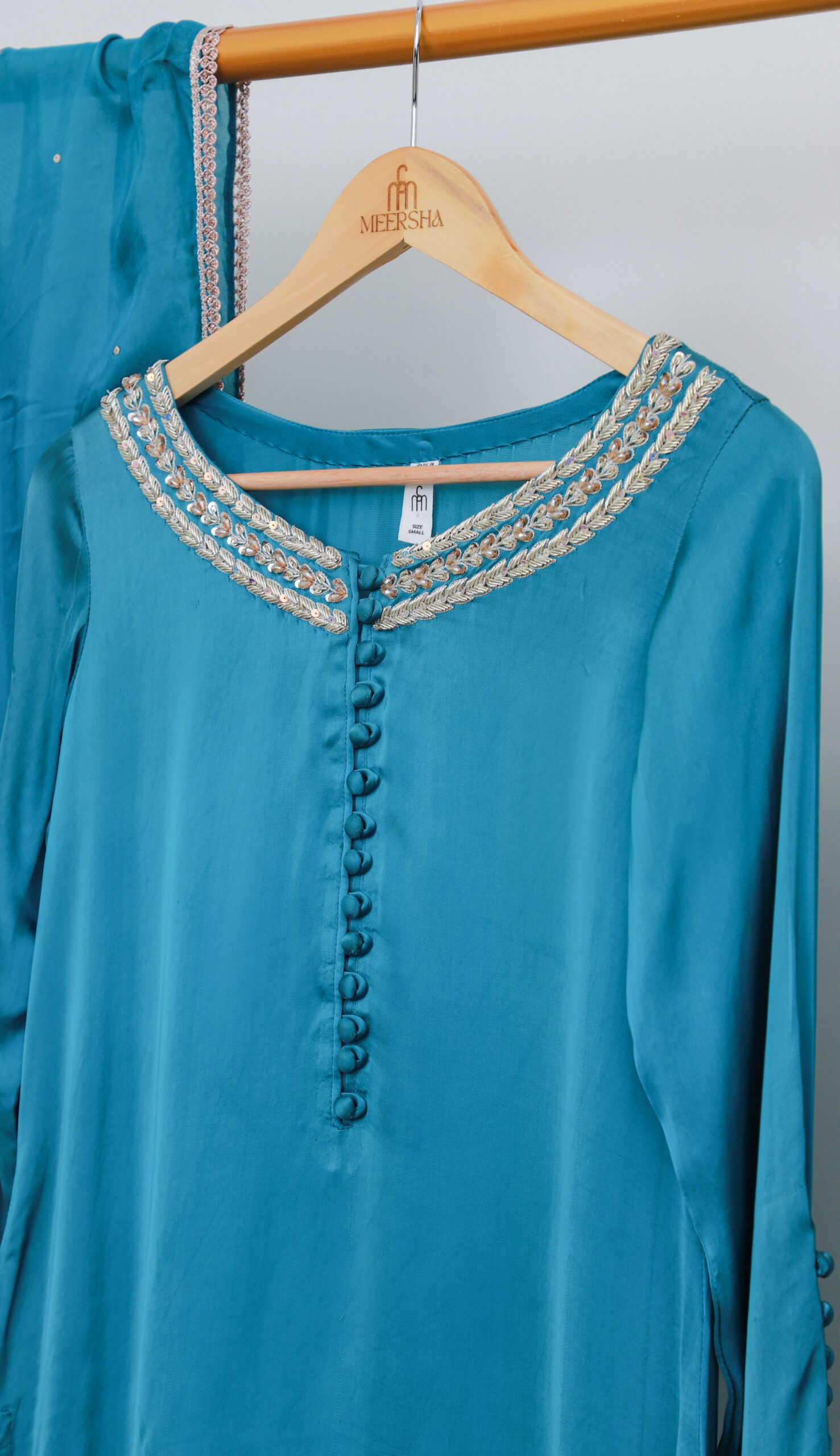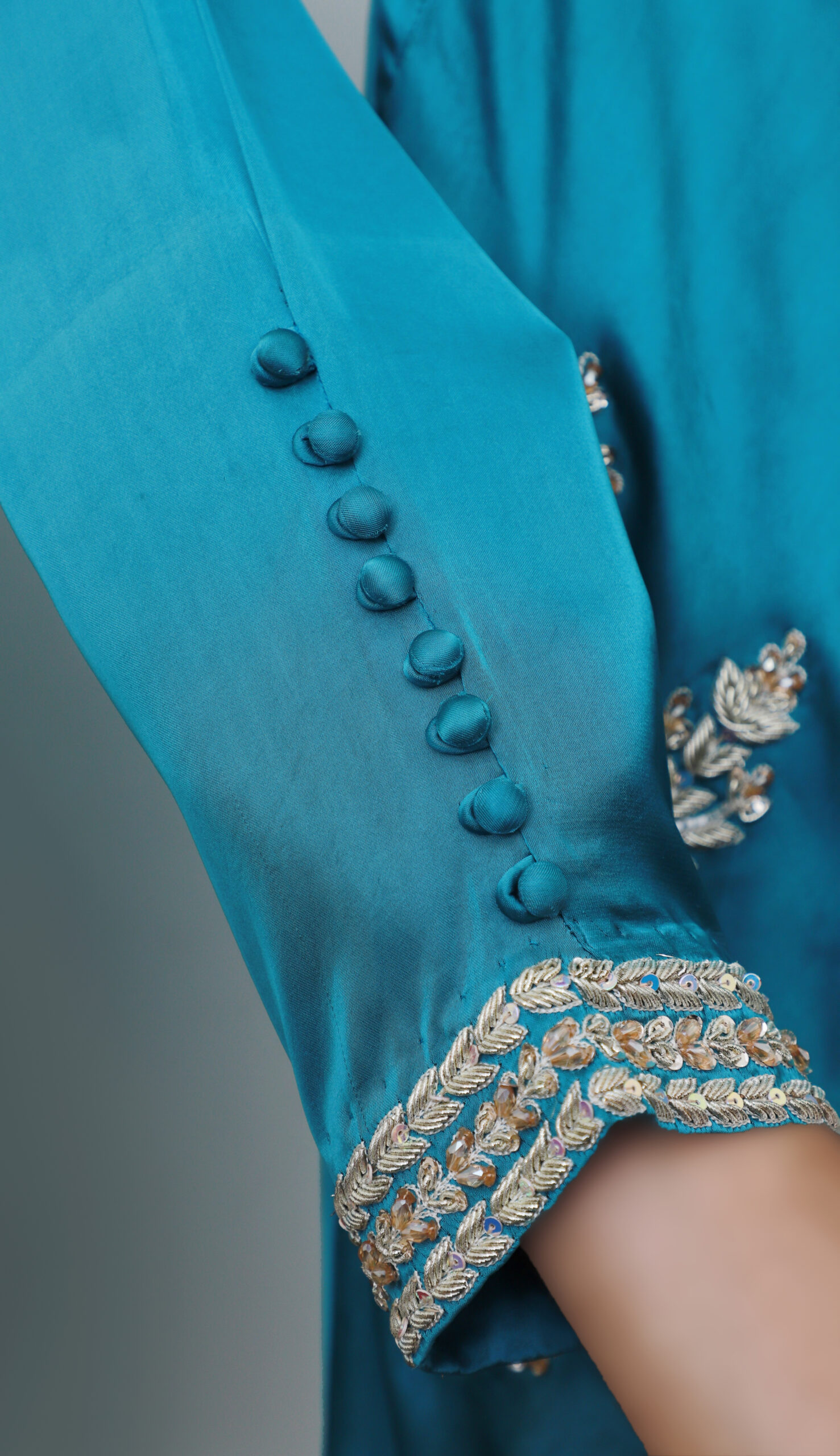 - Sleeves: Full sleeves with embellished cuffs