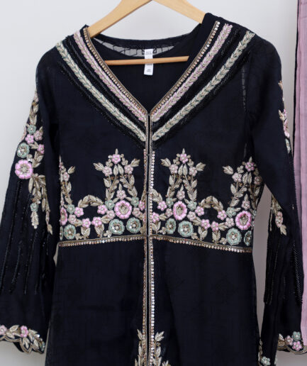 Paired with a beautifully draped embellished trouser and a lightweight chiffon dupatta with delicate detailing, this outfit is perfect for evening gatherings, festive occasions, and semi-formal events.
